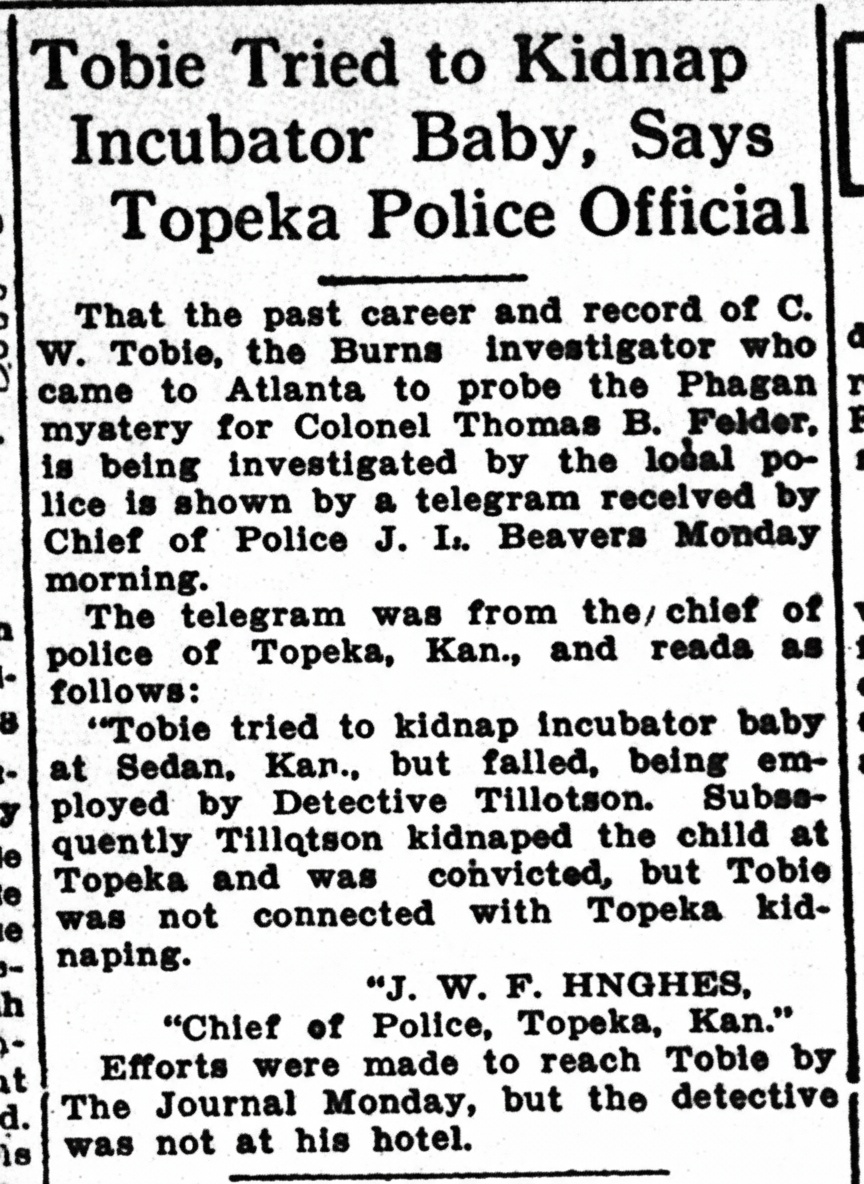 "Tobie tried to kidnap incubator baby at Sedan, Kan., but failed, being employed by Detective Tillotson. Subsequently Tillotson kidnaped the child at Topeka and was convicted, but Tobie was not connected with Topeka kidnaping.
