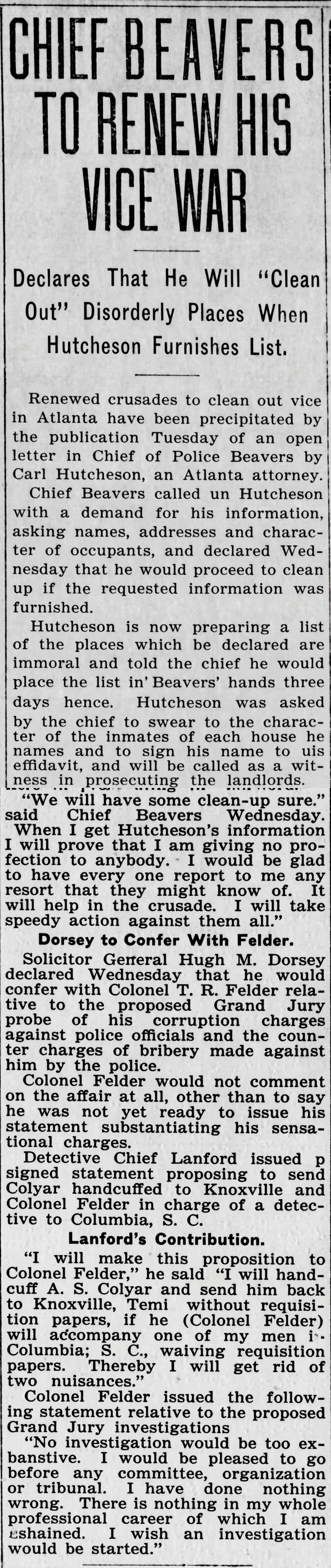 Renewed crusades to clean out vice in Atlanta have been precipitated by the publication Tuesday of an open letter to Chief of Police Beavers by Carl Hutcheson, an Atlanta attorney.