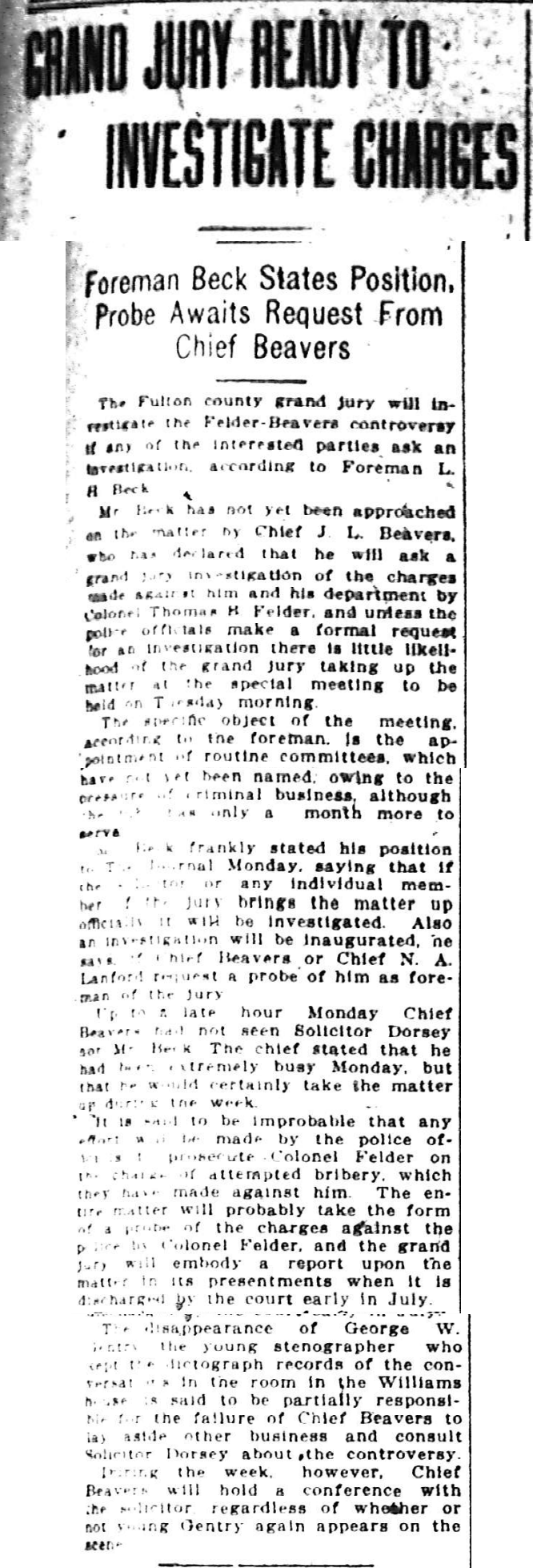 The Fulton county grand jury will investigate the Felder-Beavers controversy if any of the interested parties ask an investigation, according to Foreman L. H. Beck.
