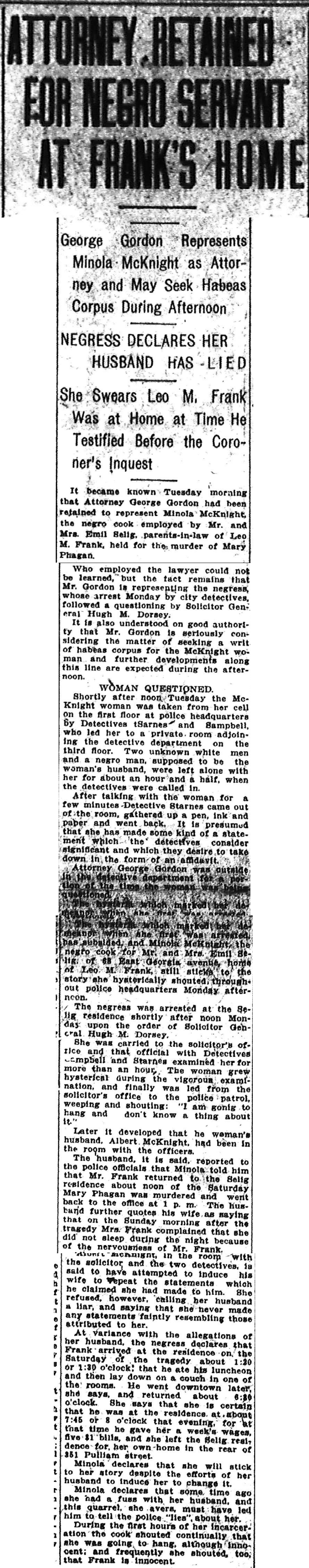 It became known Tuesday morning that Attorney George Gordon had been retained to represent Minola McKnight, the negro cook employed by Mr. and Mrs. Emil Selig, parents-in-law of Leo M. Frank, held for the murder of Mary Phagan.