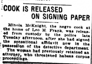 Minola McKnight, the negro cook at the home of Leo M. Frank, was released from custody by the police late Tuesday afternoon, after she had signed the sensational affidavit now in the possession of the detective department.