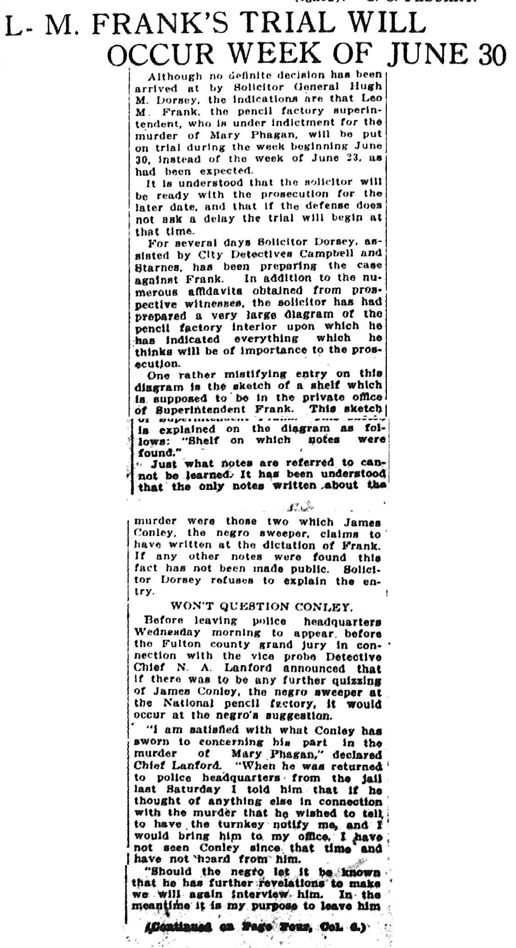 Although no definite decision has been arrived at by Solicitor General Hugh M. Dorsey, the indications are that Leo M. Frank, the pencil factory superintendent, who is under indictment for the murder of Mary Phagan, will be put on trial during the week beginning June 30, instead of the week of June 23, as had been expected.