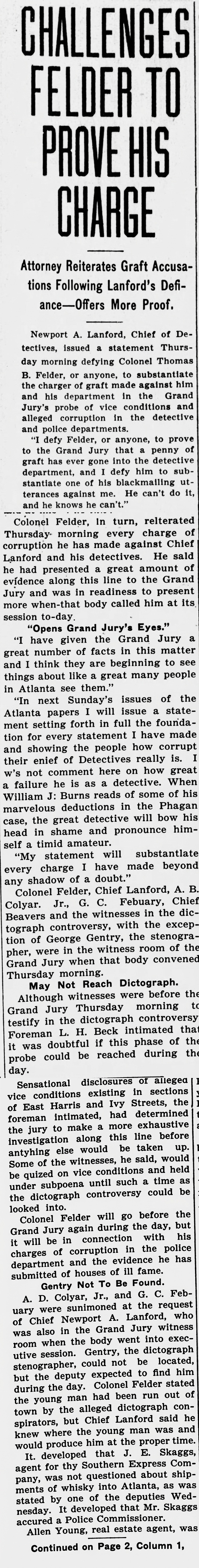 Colonel Felder, in turn, reiterated Thursday morning every charge of corruption he has made against Chief Lanford and his detectives. He said he had presented a great amount of evidence along this line to the Grand Jury and was in readiness to present more when that body called him at its session to-day.