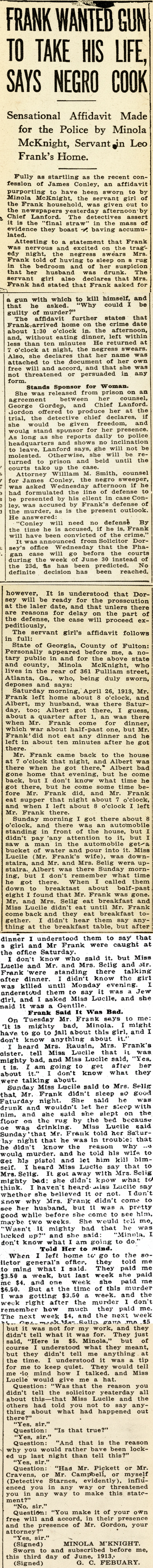 Fully as startling as the recent confession of James Conley, an affidavit purporting to have been sworn to by Minola McKnight, the servant girl of the Frank household, was given out to the newspapers yesterday afternoon by Chief Lanford. The detectives assert it is the "final straw" in the mass of evidence they boast of having accumulated.