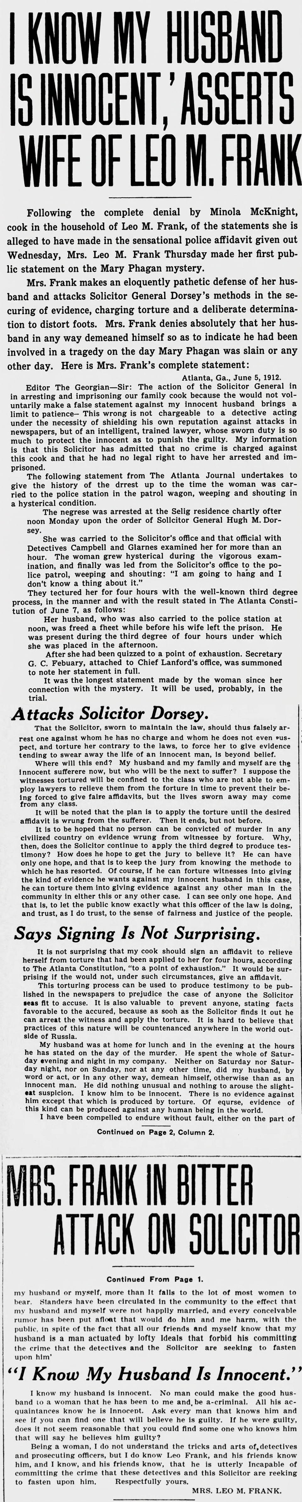 Mrs. Frank makes an eloquently pathetic defense of her husband and attacks Solicitor General Dorsey's methods in the securing of evidence, charging torture and a deliberate determination to distort facts. Mrs. Frank denies absolutely that her husband in any way demeaned himself so as to indicate he had been involved in a tragedy on the day Mary Phagan was slain or any other day. Here is Mrs. Frank's complete statement: