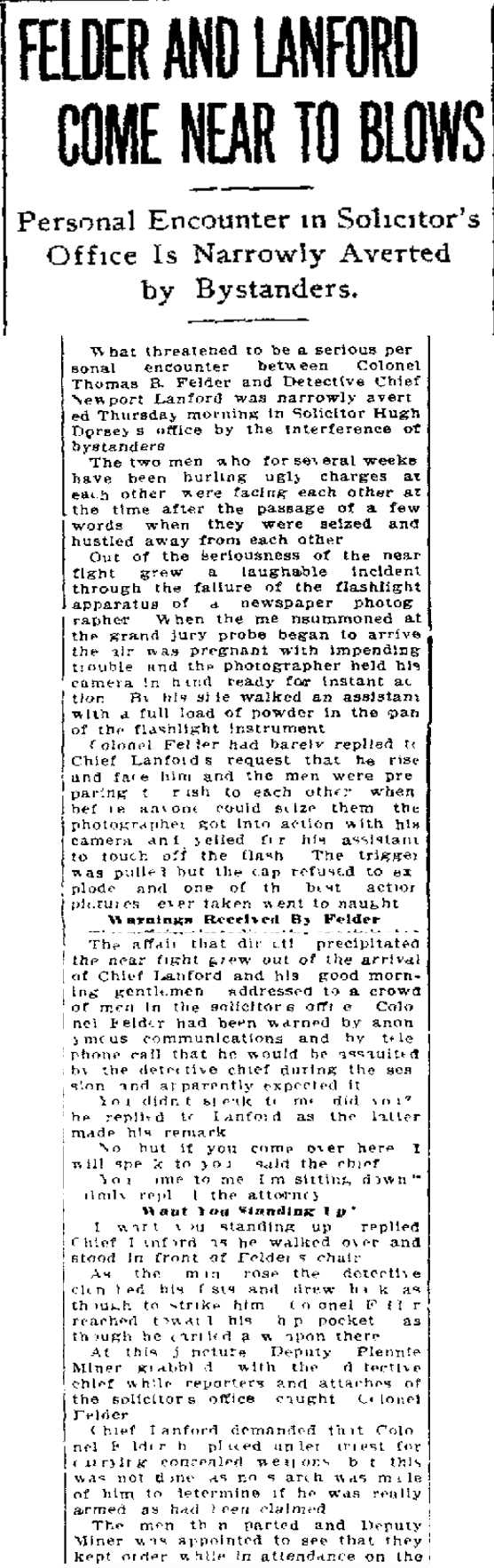 The affair that directly precipitated the near fight grew out of the arrival of Chief Lanford and his "good morning gentlemen" addressed to a crowd of men in the solicitor's office. Colonel Felder had been warned by anonymous communications and by the phone call that he would be assaulted by the detective chief during the session and apparently expected it.