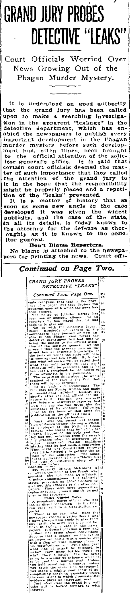 It is understood on good authority that the grand jury has been called upon to make a searching investigation in the apparent "leakage" in the detective department, which has enabled the newspapers to publish every important development in the Phagan murder mystery before such development had, often times, been brought to the official attention of the solicitor general's office. It is said that certain court officials deemed the matter of such importance that they called the attention of the grand jury to it in the hope that the responsibility might be properly placed and a repetition of the "leaks" prevented.