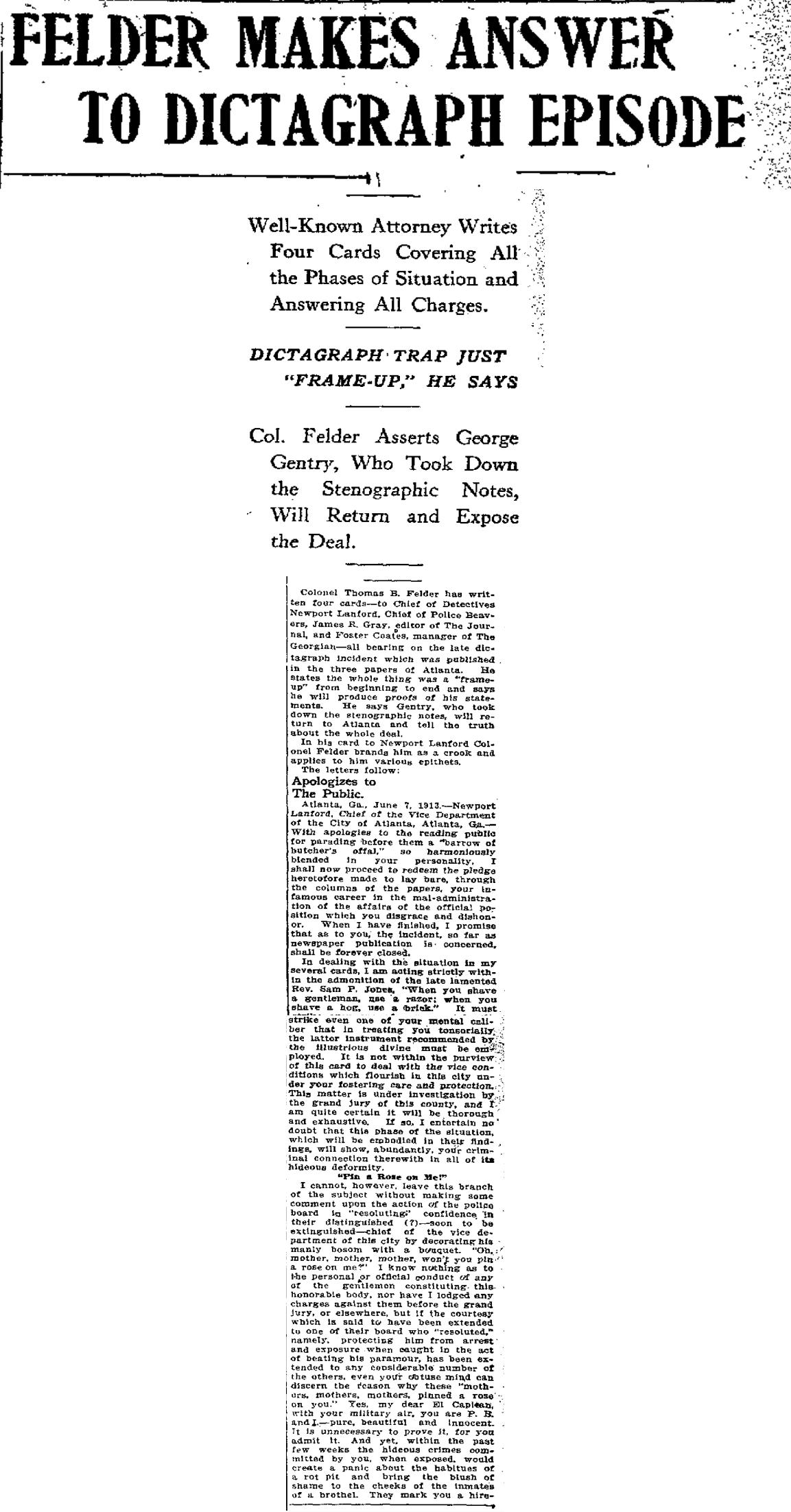 Colonel Thomas B. Felder has written four cards—to Chief of Detectives Newport Lanford, Chief of Police Beavers, James R. Gray, editor of The Journal, and Foster Coates, manager of The Georgian—all bearing on the late pictograph incident which was published in the three papers of Atlanta. He states the whole thing was a "frame-up" from beginning to end and says he will produce proofs of his statements. He says Gentry, who took down the stenographic notes, will return to Atlanta and tell the truth about the whole deal.