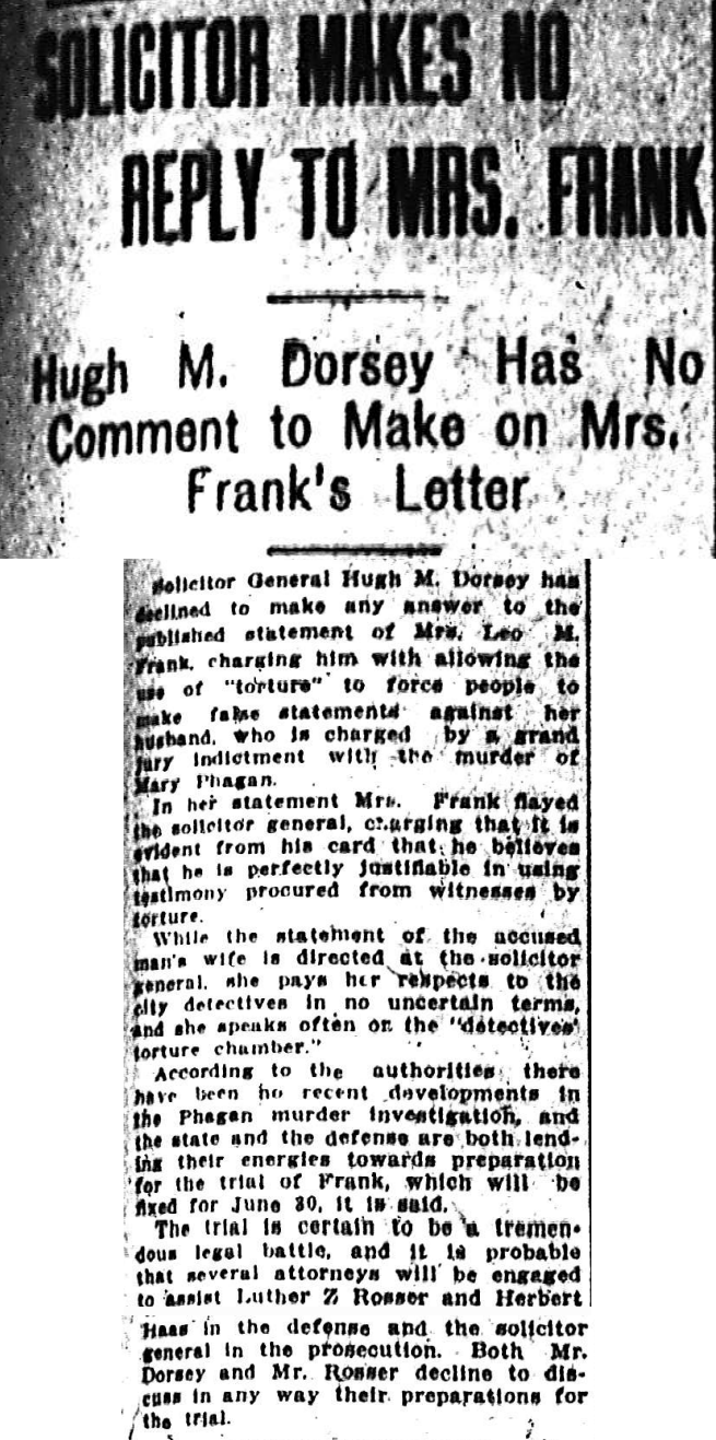 Solicitor General Hugh M. Dorsey has declined to make any answer to the published statement of Mrs. Leo M. Frank, charging him with allowing the use of "torture" to force people to make false statements against her husband, who is charged by a grand jury indictment with the murder of Mary Phagan.
