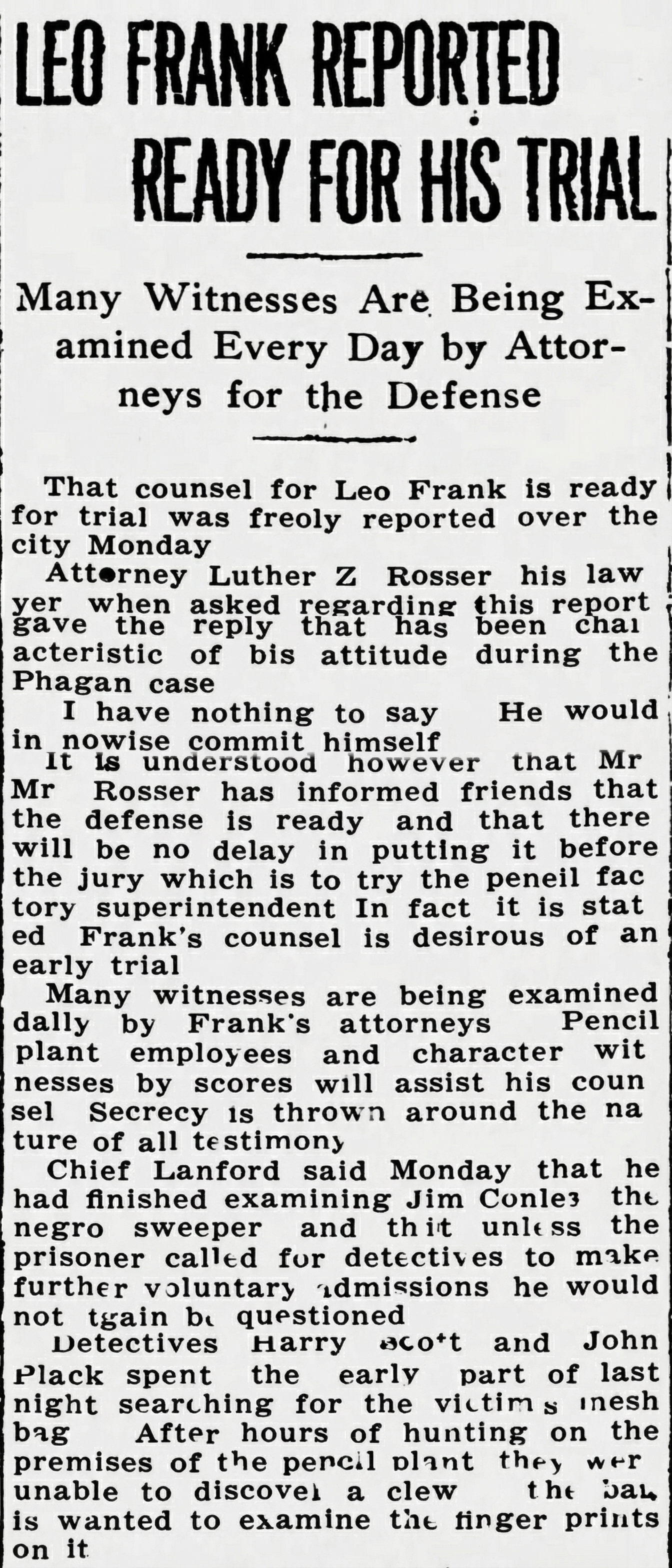 Attorney Luther Z. Rosser, his lawyer, when asked regarding this report, gave the reply that has been characteristic of his attitude during the Phagan case.