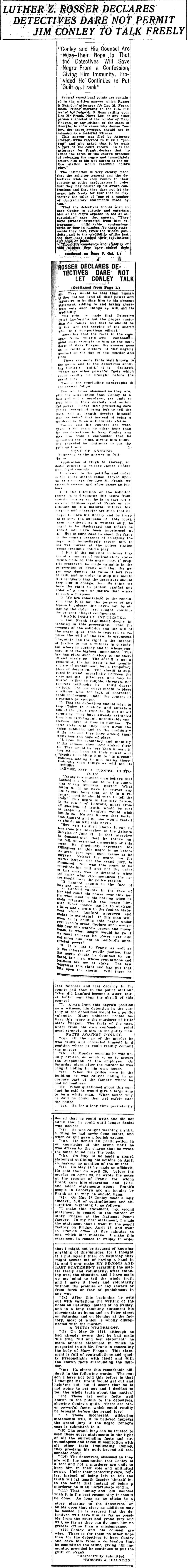 Several sensational points are contained in the written answer which Rosser & Brandon, attorneys for Leo M. Frank, made Friday morning to the rule nisi issued by Judge L. S. Roan calling upon Leo M. Frank, Newt Lee, or any other person suspected of the murder of Mary Phagan, or any citizen of the state of Georgia, to show cause why James Conley, the negro sweeper, should not be released as a material witness.