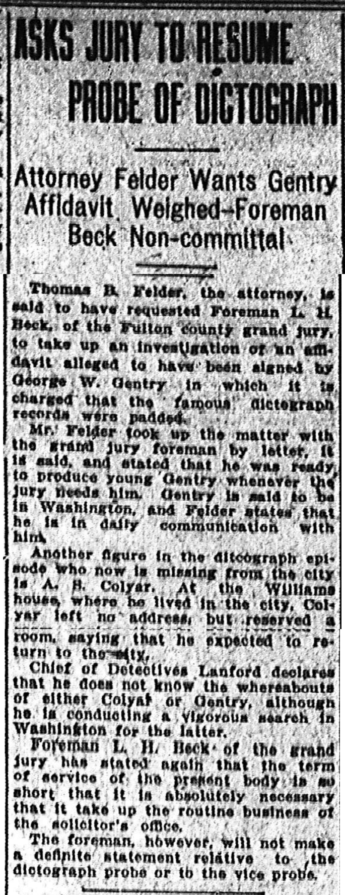 Thomas B. Felder, the attorney, is said to have requested Foreman L. H. Beck, of the Fulton county grand jury, to take up an investigation of an affidavit alleged to have been signed by George W. [sic] Gentry in which it is charged that the famous dictograph records were padded.