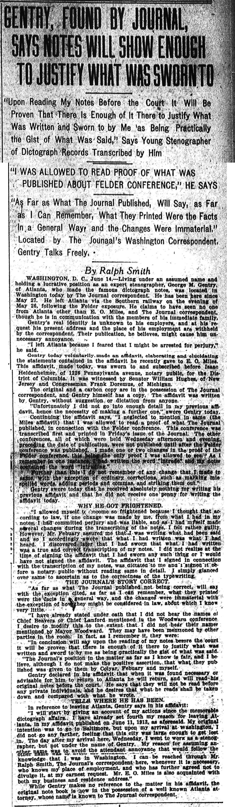 "I will start by giving an account of my actions since the memorable dictograph affairs. I have already set fourth [sic] my reason for leaving Atlanta, in my affidavit published on June 11, 1913, as aforesaid. My original intention was to go to Baltimore, but upon my arrival at Washington, I did not go any farther, feeling that this city was large enough to get lost in. The day after my arrival here, Wednesday, I went to work as a stenographer, but not under the name of Gentry. My reason for assuming another name was to avoid the attendant annoyance that would follow the knowledge that I was in Washington. I can be reached through Mr. Ralph Smith, The Journal's correspondent here, whenever it is necessary, who knows my place of employment, and who has further agreed not to divulge it, at my earnest request. Mr. E. O. Miles is also acquainted with both my business and residence address."