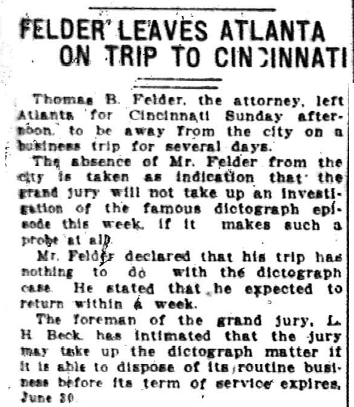 Mr. Felder declared that his trip has nothing to do with the dictograph case. He stated that he expected to return within a week.