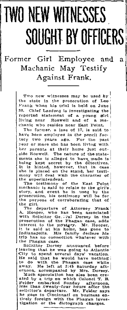 Two new witnesses may be used by the state in the prosecution of Leo Frank when his trial is held on June 30. Chief Lanford is investigating the reported statement of a young girl living near Roswell and of a mechanic who resides near East Point.