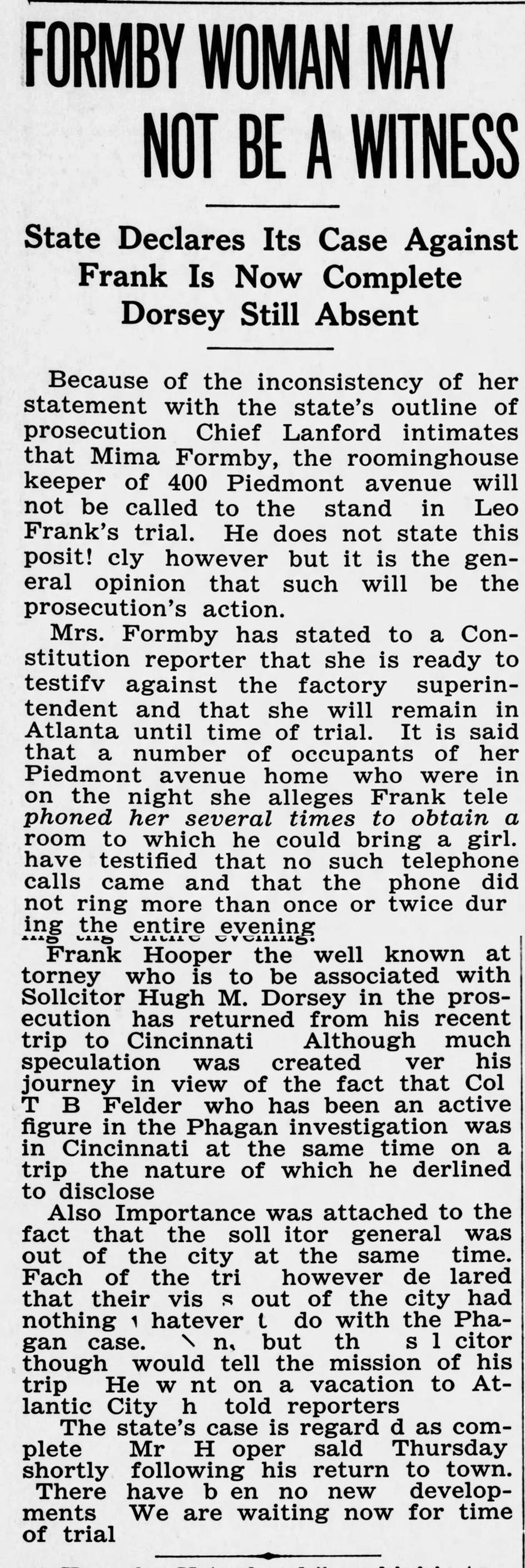 Because of the inconsistency of her statement with the state's outline of prosecution, Chief Lanford intimates that Mima Formby [sic], the roominghouse keeper of 400 Piedmont avenue, will not be called to the stand in Leo Frank's trial. He does not state this positively, however, but it is the general opinion that such will be the prosecution's action.