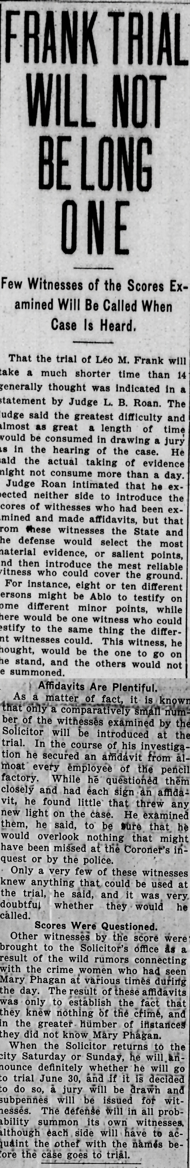 That the trial of Leo M. Frank will take a much shorter time that is generally thought was indicated in a statement by Judge L. S. Roan. The judge said the greatest difficulty and almost as great a length of time would be consumed in drawing a jury as in the hearing of the case. He said the actual taking of evidence might not consume more than a day.