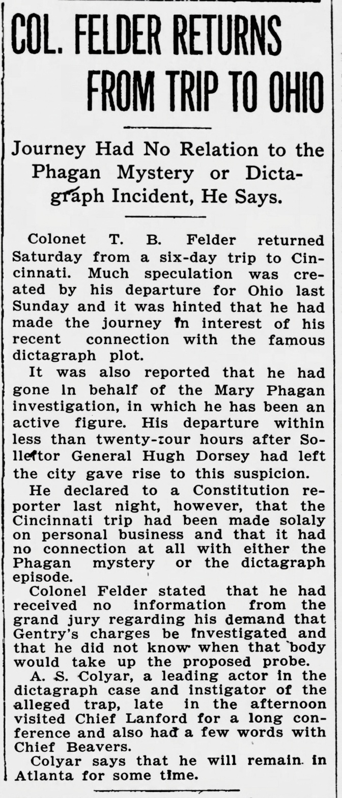 Colonel T. B. Felder returned Saturday from a six-day trip to Cincinnati. Much speculation was created by his departure for Ohio last Sunday and it was hinted that he had made the journey in interest of his recent connection with the famous dictagraph plot.