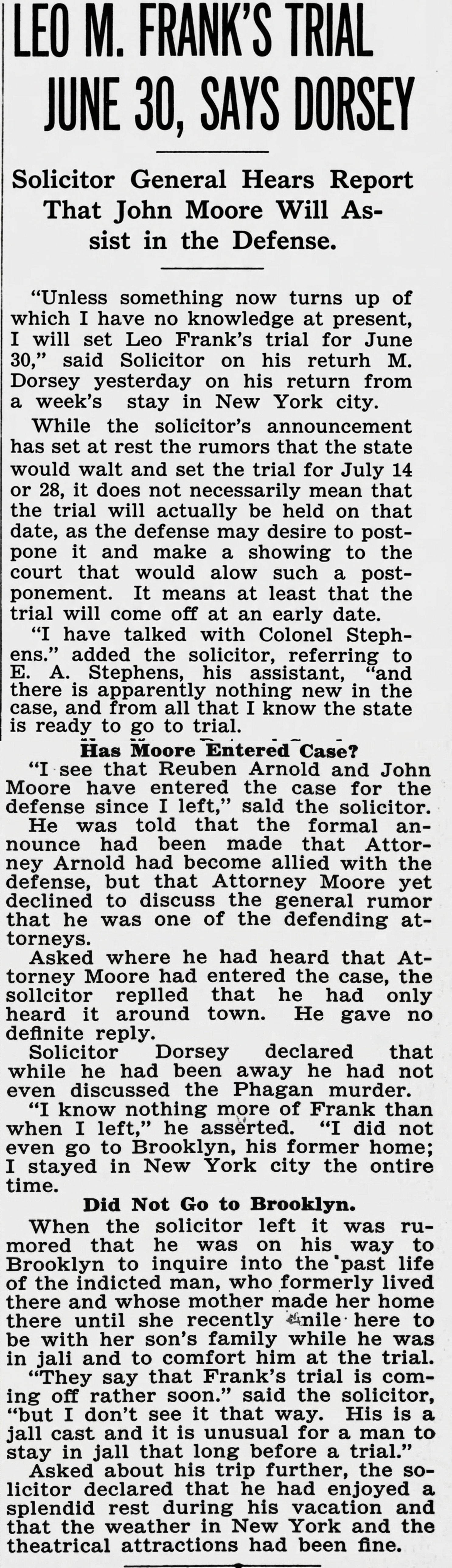 "Unless something now turns up of which I have no knowledge at present, I will set Leo Frank's trial for June 30," said Solicitor General Hugh M. Dorsey yesterday on his return from a week's stay in New York city.