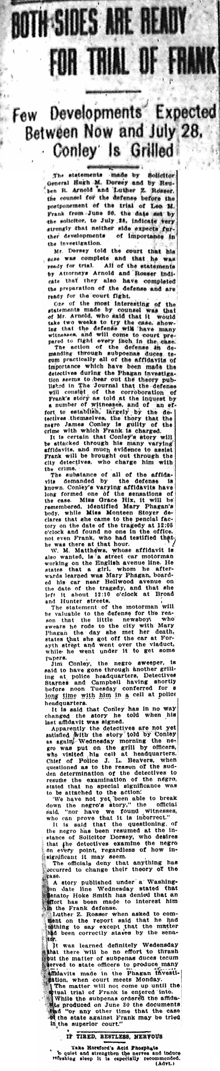 The statements made by Solicitor General Hugh M. Dorsey and by Reuben R. Arnold and Luther Z. Rosser, the counsel for the defense before the postponement of the trial of Leo M. Frank from June 30, the date set by the solicitor, to July 28, indicate very strongly that neither side expects further developments of importance in the investigation.