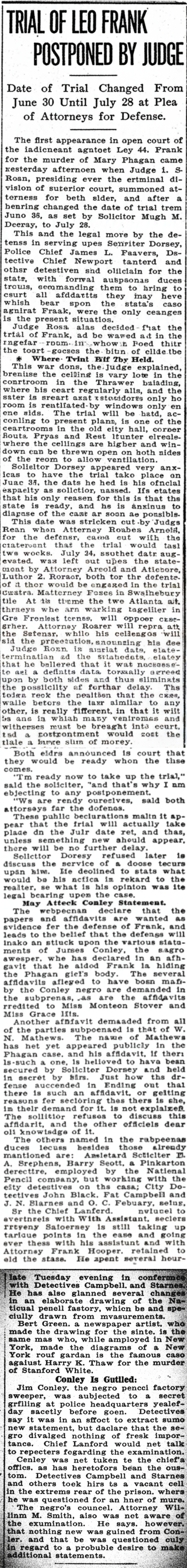 The first appearance in open court of the indictment against Leo M. Frank for the murder of Mary Phagan came yesterday afternoon when Judge L. S. Roan, presiding over the criminal division of superior court, summoned attorneys for both sides, and after a hearing changed the date of trial from June 30, as set by Solicitor Hugh M. Dorsey, to July 28.