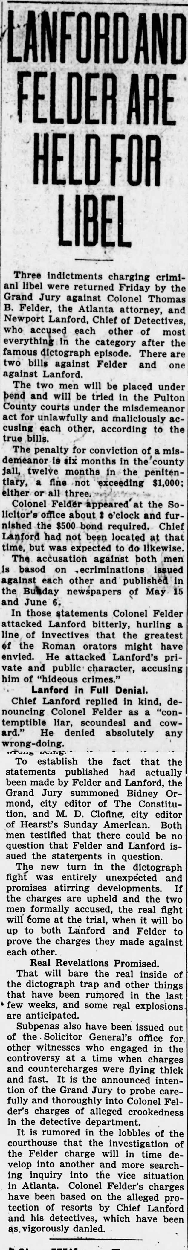 Three indictments charging criminal libel were returned Friday by the Grand Jury against Colonel Thomas B. Felder, the Atlanta attorney, and Newport Lanford, Chief of Detectives, who accused each other of most everything in the category after the famous dictograph episode. There are two bills against Felder and one against Lanford.