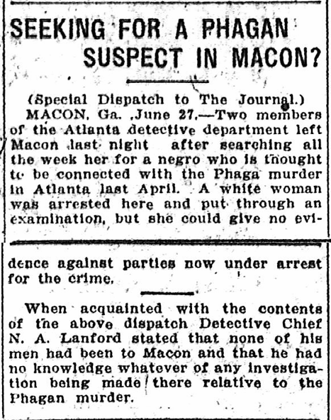 MACON, Georgia, June 27.—Two members of the Atlanta detective department left Macon last night after searching all the week her for a negro who is thought to be connected with the Phaga [sic] murder in Atlanta last April. A white woman was arrested here and put through an examination, but she could give no evidence against parties now under arrest for the crime.