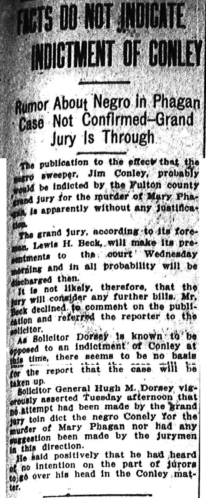 Solicitor General Hugh M. Dorsey vigorously asserted Tuesday afternoon that no attempt had been made by the grand jury toin dict [sic] the negro Conely [sic] for the murder of Mary Phagan nor had any suggestion been made by the jurymen in this direction.