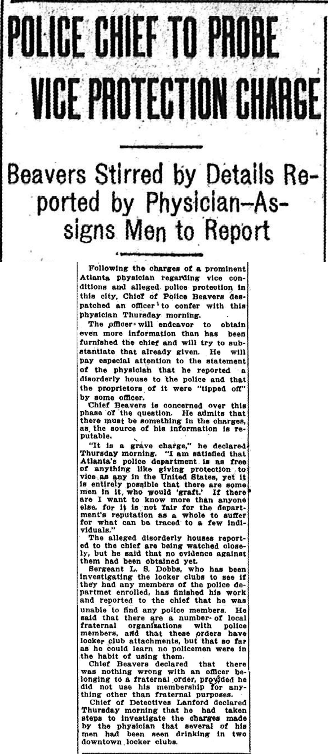 Following the charges of a prominent Atlanta physician regarding vice conditions and alleged police protection in this city, Chief of Police Beavers despatched an officer to confer with this physician Thursday morning.