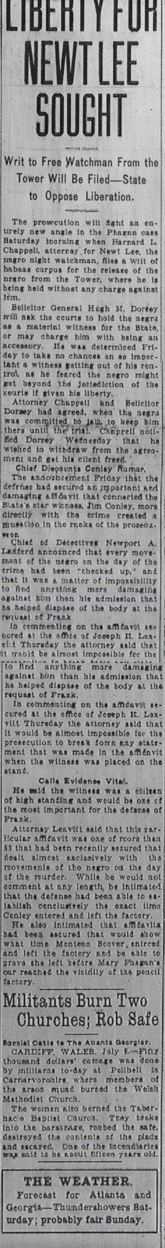 The prosecution will fight an entirely new angle in the Phagan case Saturday morning when Barnard [sic] L. Chappell, attorney for Newt Lee, the negro night watchman, files a writ of habeas corpus for the release of the negro from the Tower, where he is being held without any charge against him.