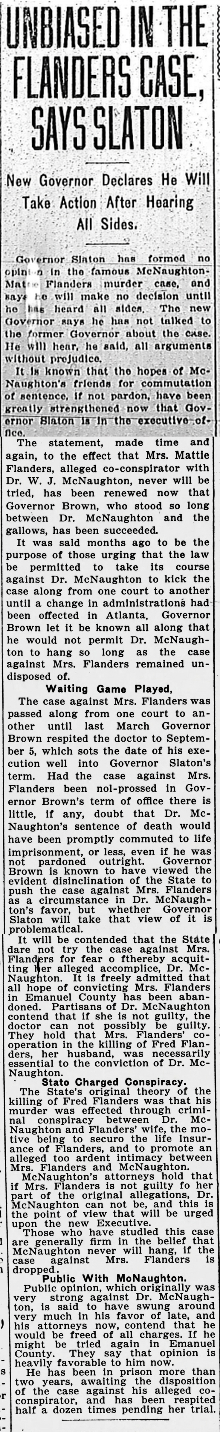 The case against Mrs. Flanders was passed along from one court to another until last March. Governor Brown respited the doctor to September 5, which sets the date of his execution well into Governor Slaton's term. Had the case against Mrs. Flanders been nol-prossed in Governor Brown's term of office there is little, if any, doubt that Dr. McNaughton's sentence of death would have been promptly commuted to life imprisonment, or less, even if he was not pardoned outright. Governor Brown is known to have viewed the evident disinclination of the State to push the case against Mrs. Flanders as a circumstance in Dr. McNaughton's favor, but whether Governor Slaton will take that view of it is problematical.