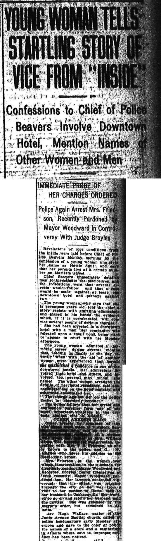 Revelations of vice conditions from the inside were laid before Chief of Police Beavers Monday morning by the confession of a young woman who gives her name as Hattie Smith and says that her parents live at a certain number on Marietta street.