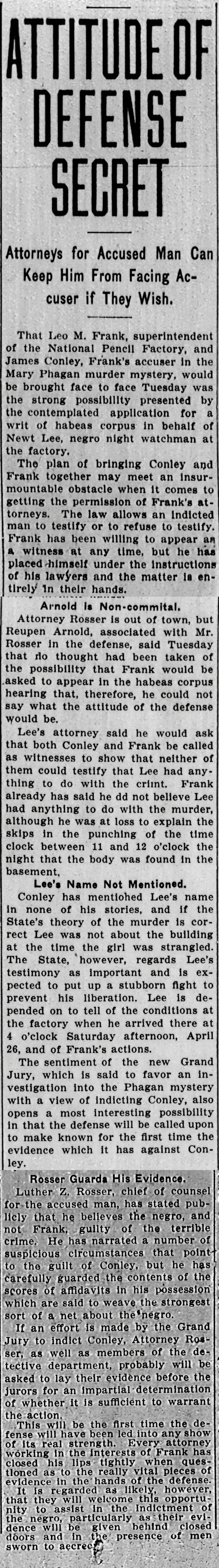Attorney Rosser is out of town, but Reuben Arnold, associated with Mr. Rosser in the defense, said Tuesday that no thought has been taken of the possibility that Frank would be asked to appear in the habeas corpus hearing that, therefore, he could not say what the attitude of the defense would be.