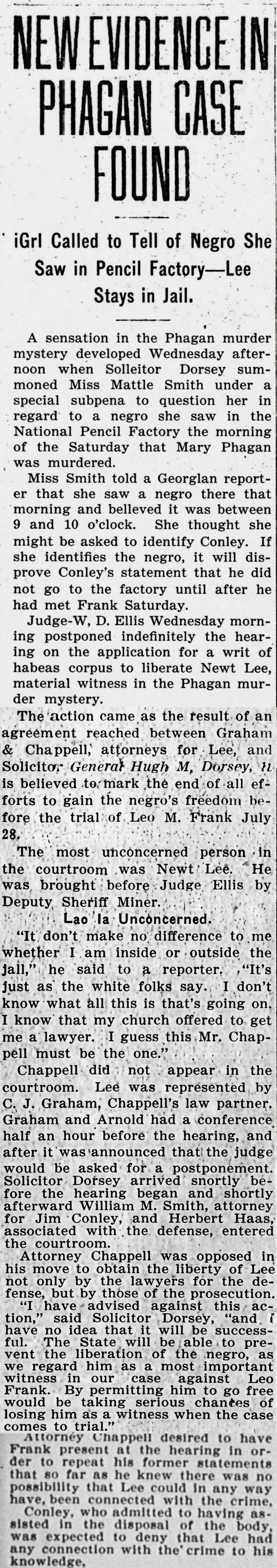 "I have advised against this action," said Solicitor Dorsey, "and I have no idea that it will be successful. The State will be able to prevent the liberation of the negro, as we regard him as a most important witness in our case against Leo Frank. By permitting him to go free would be taking serious chances of losing him as a witness when the case comes to trial."