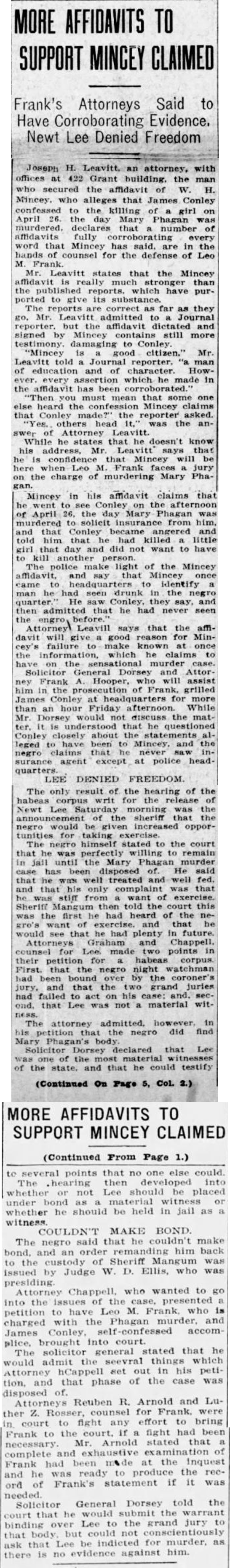 Joseph H. Leavitt, an attorney, with offices at 422 Grant building, the man who secured the affidavit of W.H. Mincey, who alleges that James Conley confessed to the killing of a girl on April 26, the day Mary Phagan was murdered, declares that a number of affidavits fully corroborating every word that Mincey has said, are in the hands of counsel for the defense of Leo M. Frank.