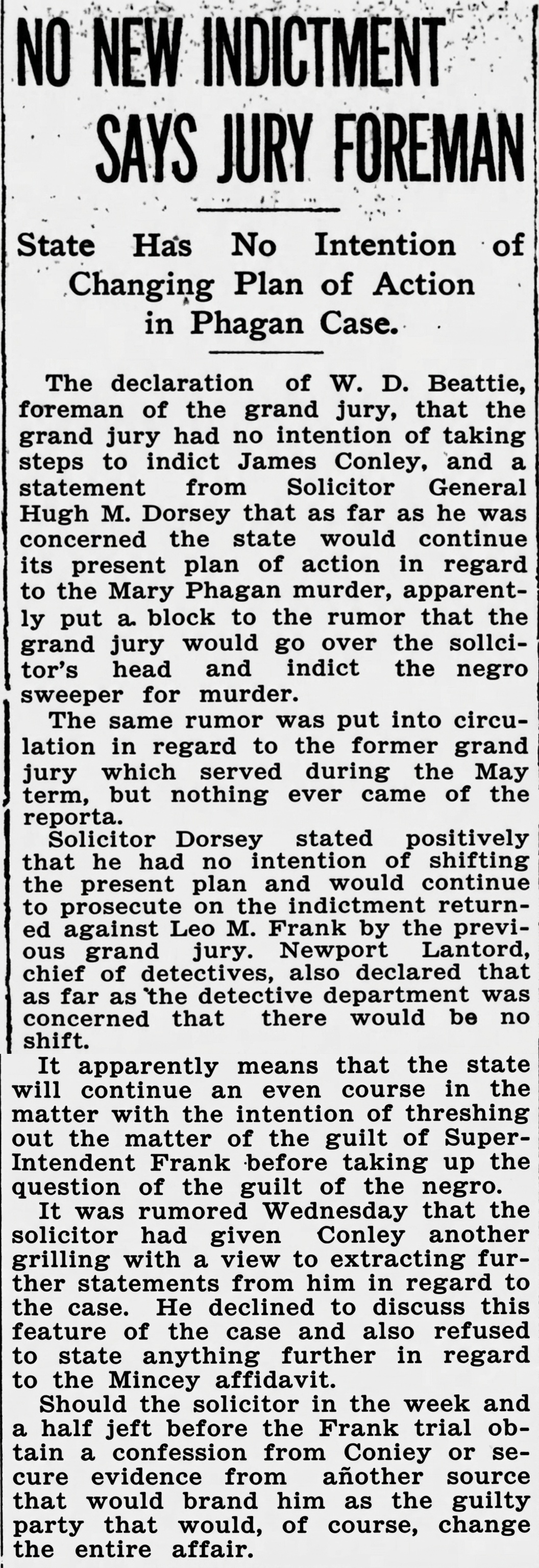 The declaration of W.D. Beattie, foreman of the grand jury, that the grand jury had no intention of taking steps to indict James Conley, and a statement from Solicitor General Hugh M. Dorsey that as far as he was concerned the state would continue its present plan of action in regard to the Mary Phagan murder, apparently put a block to the rumor that the grand jury would go over the solicitor's head and indict the negro sweeper for murder.