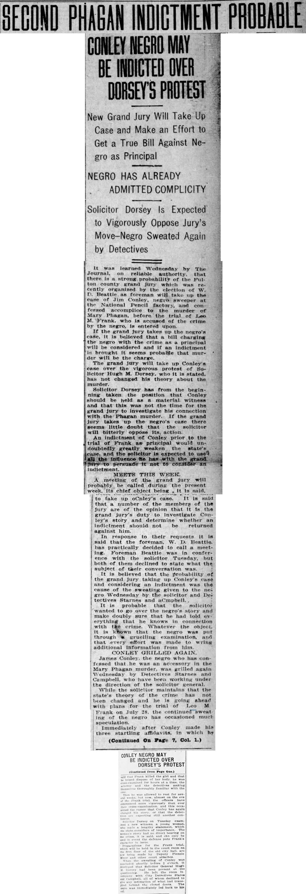 An indictment of Conley prior to the trial of Frank as principal would undoubtedly greatly weaken the state's case, and the solicitor is expected to use […] jury to persuade if not to consider an indictment.