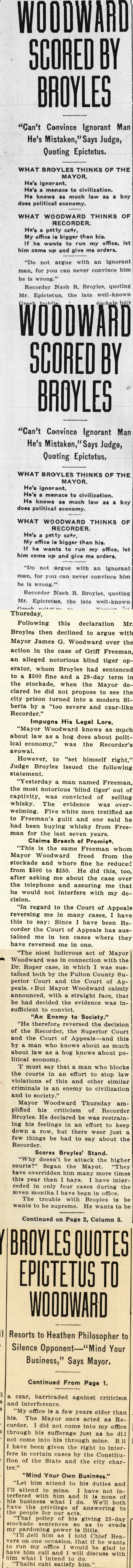 Following this declaration Mr. Broyles then declined to argue with Mayor James G. Woodward over the action in the case of Griff Freeman, an alleged notorious blind tiger operator, whom Broyles had sentenced to a $500 fine and a 29-day term in the stockade, when the Mayor declared he did not propose to see the city prison turned into a modern Siberia by a "too severe and czar-like Recorder."
