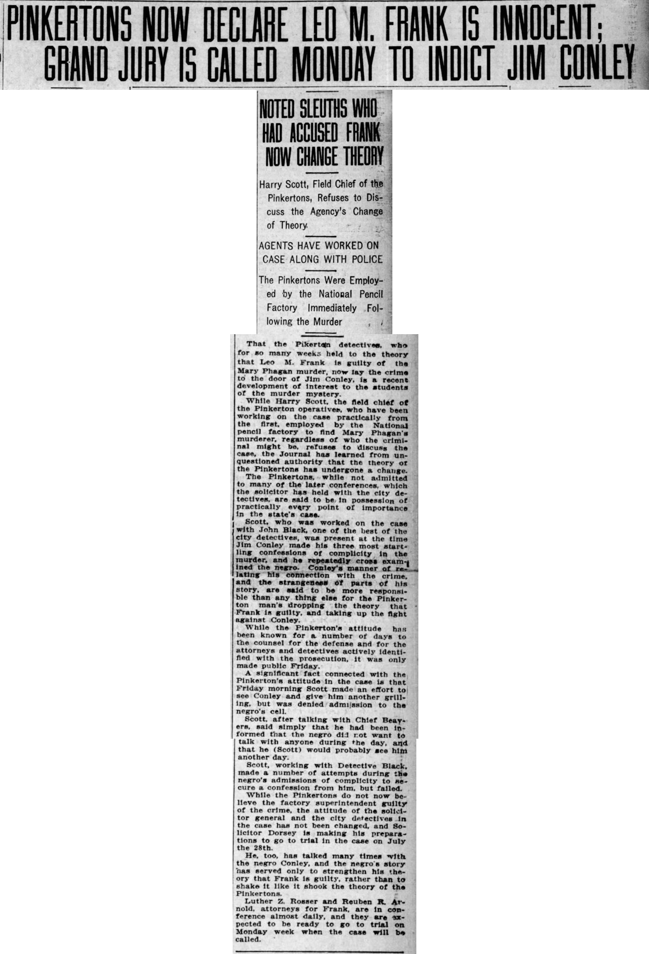 Scott, who was [sic] worked on the case with John Black, one of the best of the city detectives, was present at the time Jim Conley made his three most startling confessions of complicity in the murder, and he […] the negro Conley's manner of […] connection with the crime, and the strangeness of parts of his story, are said to be more responsible than any thing else for the Pinkerton man's dropping the theory that Frank is guilty, and taking up the fight against Conley.