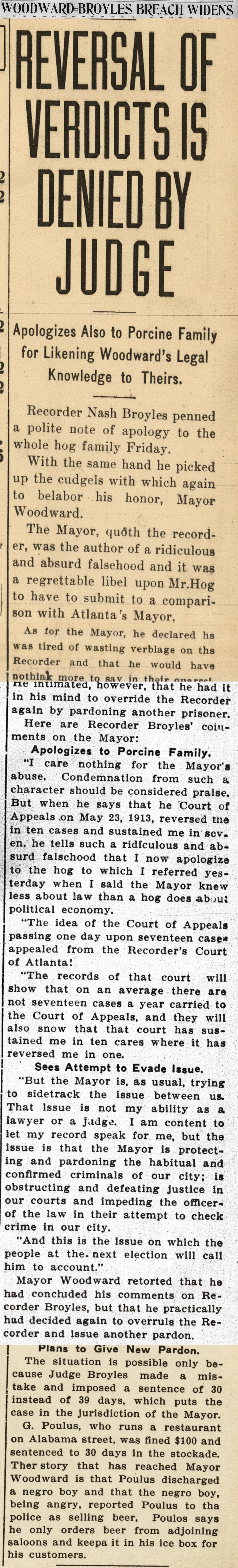 "I care nothing for the Mayor's abuse. Condemnation from such a character should be considered praise. But when he says that he [sic] Court of Appeals on May 23, 1913, reversed me in ten cases and sustained me in seven, he tells such a ridiculous and absurd falsehood that I now apologize to the hog to which I referred yesterday when I said the Mayor knew less about law than a hog does about political economy.