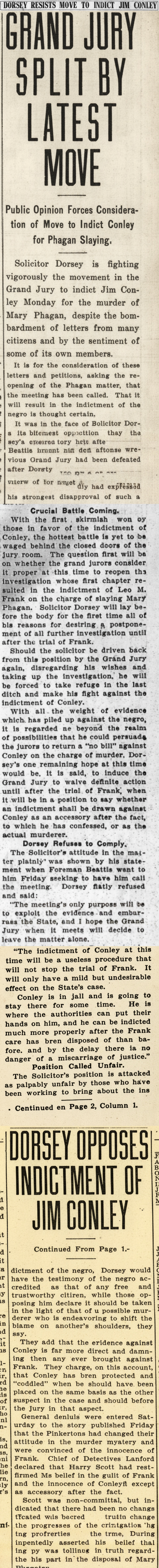 With the first skirmish won by those in favor of the indictment of Conley, the hottest battle is yet to be waged behind the closed doors of the jury room. The question first will be on whether the grand jurors consider it proper at this time to reopen the investigation whose first chapter resulted in the indictment of Leo M. Frank on the charge of slaying Mary Phagan. Solicitor Dorsey will lay before the body for the first time all of his reasons for desiring a postponement of all further investigation until after the trial of Frank.