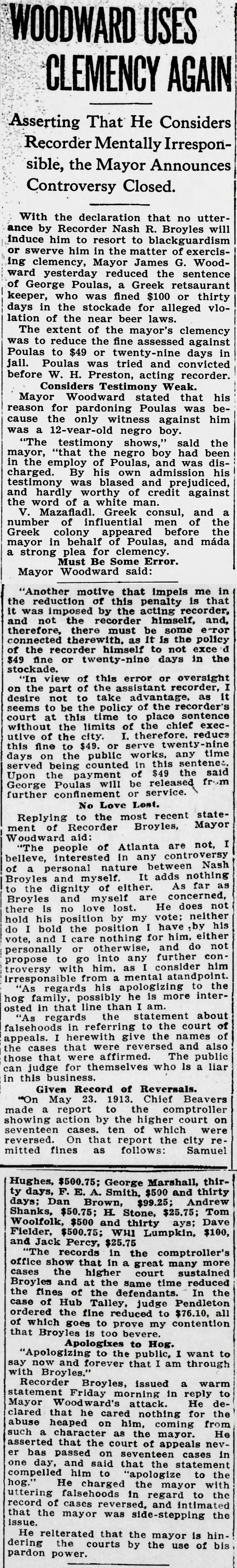 With the declaration that no utterance by Recorder Nash R. Broyles will induce him to resort to blackguardism or swerve him in the matter of exercising clemency, Mayor James G. Woodward yesterday reduced the sentence of George Poulas, a Greek retsaurant [sic] keeper, who was fined $100 or thirty days in the stockade for alleged violation of the near beer laws.