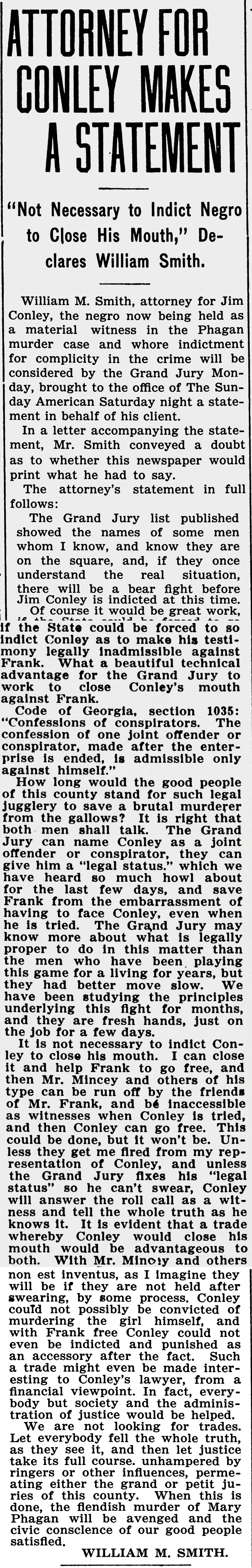 William M. Smith, attorney for Jim Conley, the negro now being held as a material witness in the Phagan murder case and whose indictment for complicity in the crime will be considered by the Grand Jury Monday, brought to the office of The Sunday American Saturday night a statement in behalf of his client.