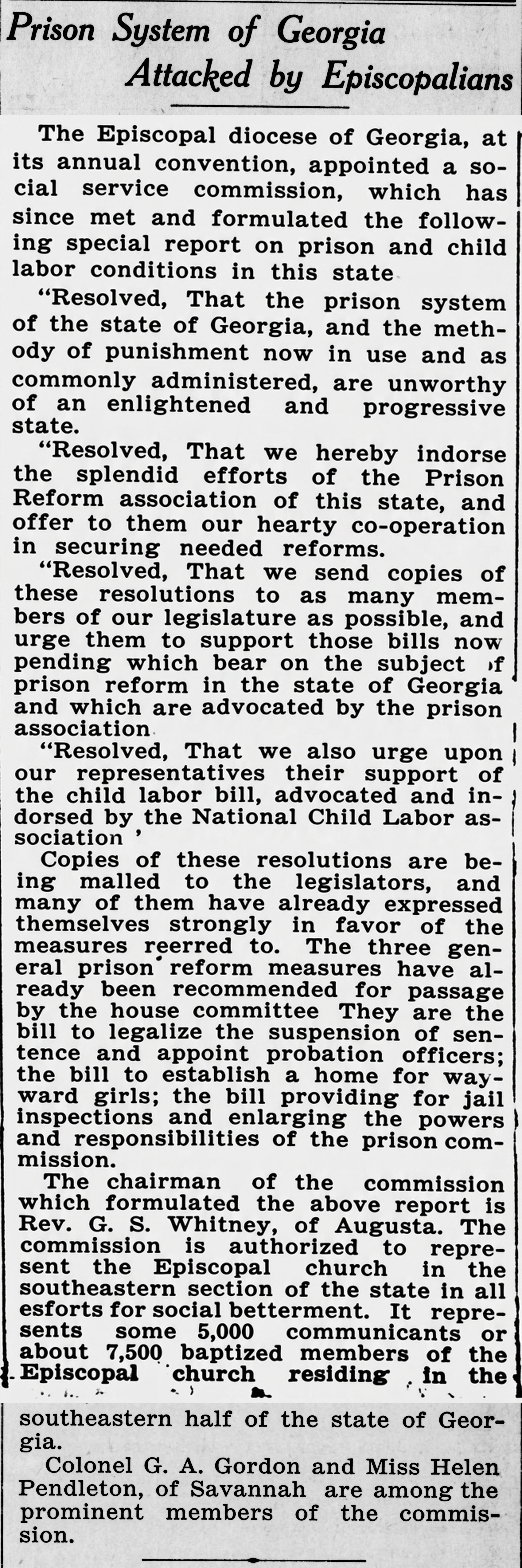 The Episcopalian diocese of Georgia, at its annual convention, appointed a social service commission, which has since met and formulated the following special report on prison and child labor conditions in this state.