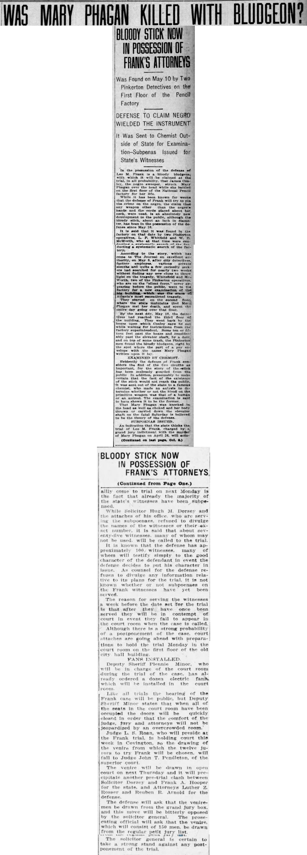 While it has been known for weeks that the defense of Frank will try to pit the crime on the negro, the claim that any weapon other than the negro's hands and the cords placed about her neck, were used, is an absolutely new development to the public, although the bloody stick, about an inch in diameter, has been in the possession of the defense since May 10.