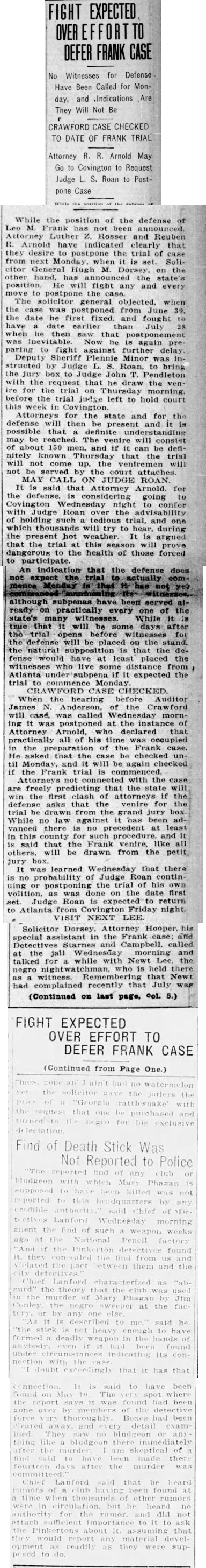 An indication that the defense does not expect the trial to actually commence Monday in that it has not [text illegible from original newspaper] of its witnesses, although subpenas have been served already on practically every one of the state's many witnesses. While it is true that it will be some days after the trial opens before witnesses for the defense will be place on the stand, the natural supposition is that the defense would have at least placed the witnesses who live some distance from Atlanta under subpena if it expected the trial to commence Monday.