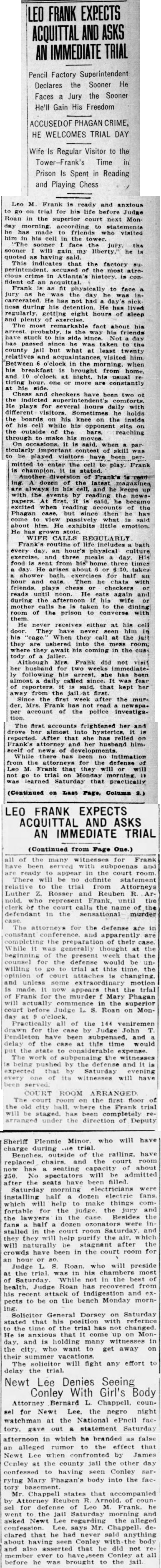 Leo M. Frank is ready and anxious to go on trial for his life before Judge Roan in the superior court next Monday morning, according to statements he has made to friends who visited him in his cell in the tower.