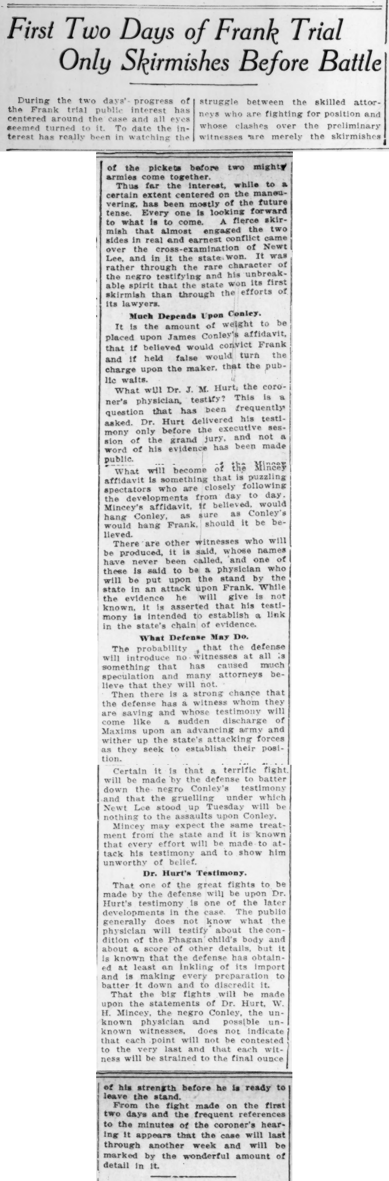 That the big fights will be made upon the statements of Dr. Hurt, W. H. Mincey, the negro Conley, the unknown physician and possible unknown witnesses, does not indicate that each point will not be contested to the very last and that each witness will be strained to the final ounce of his strength before he is ready to leave the stand.