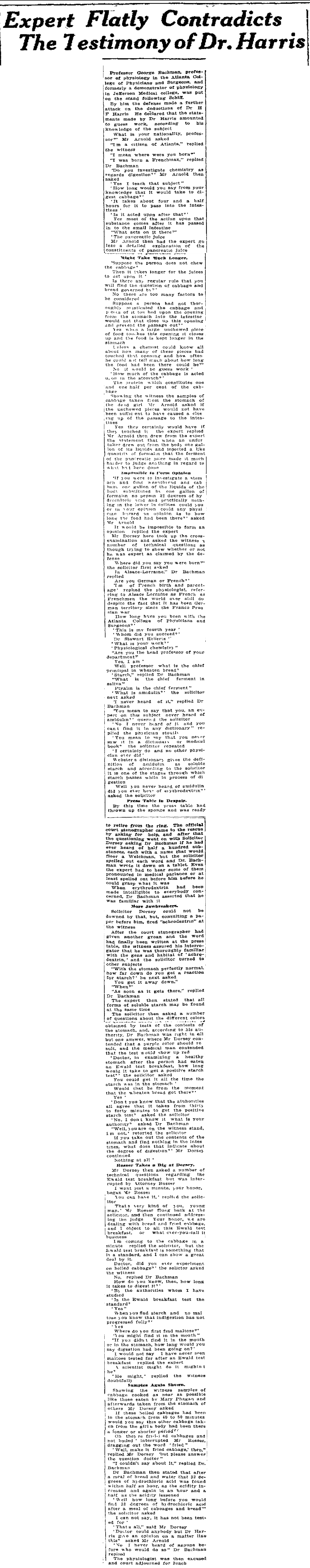 By this time the press table had thrown up the sponge and was ready to retire from the ring. The official court stenographer came to the rescue by asking for help, and after that the questioning went on with Solicitor Dorsey asking Dr. Bachman if he had ever heard of half a hundred substances, each with a name that would floor a Welchman, but the solicitor spelled out each work and Dr. Bachman wrote it down on a tablet. Even the expert had to hear some of them pronounced in medical parlance or at least spelled out before him before he could grasp what it was.