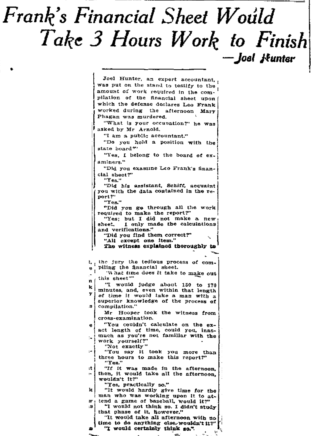 Joel Hunter, an expert accountant, was put on the stand to testify to the amount of work required in the compilation of the financial sheet upon which the defense declares Leo Frank worked during the afternoon Mary Phagan was murdered.